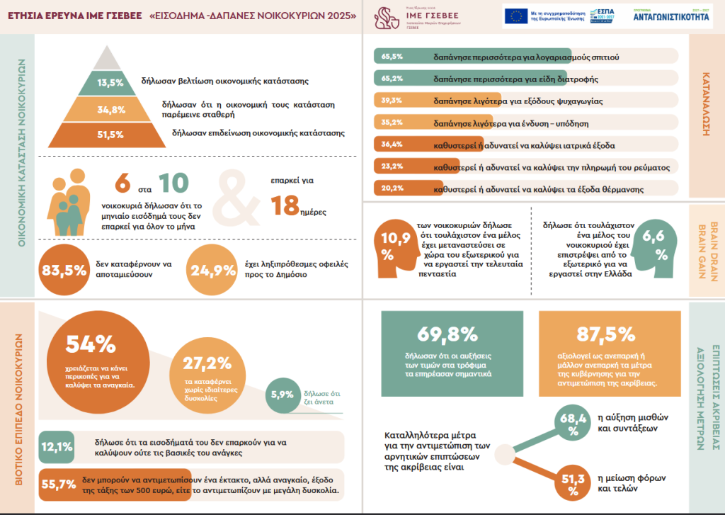 Het jaarlijkse onderzoek van het IME GSEVEE naar het inkomen en de uitgaven van huishoudens in 2025, het 14e op rij, laat zien dat Griekse huishoudens nog steeds onder druk staan en dat die druk alleen maar groter wordt. Uit de bevindingen van dit jaar blijkt dat de financiële moeilijkheden niet langer beperkt blijven tot lage inkomens, maar zich ook uitbreiden naar de middeninkomens, aangezien de inflatoire druk cumulatief werkt en de weerbaarheid van huishoudens geleidelijk wegsmelt.